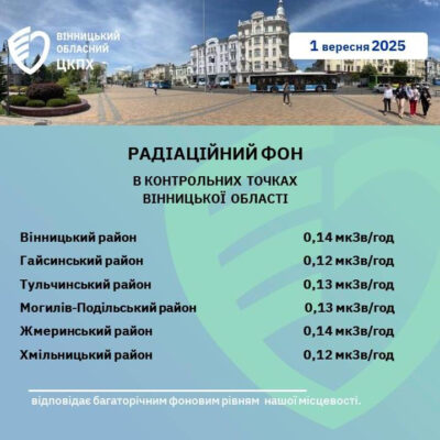 Станом на 1 вересня 2025 року показники радіаційного фону у Вінницькій області залишаються в межах норми. У контрольних точках зафіксовані такі значення: Повідомили Вінницький обласний центр контролю та профілактики хвороб МОЗ України У Вінницькому районі рівень складає 0,14 мкЗв/год, що відповідає багаторічним фоновим показникам місцевості та не перевищує безпечні норми. Фахівці наголошують: поточні значення не […]