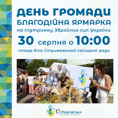 30 серпня, до Дня Стрижавської територіальної громади, у селищі Стрижавка пройде благодійна ярмарка на підтримку ЗСУ. Повідомили Стрижавська територіальна громада У межах заходу будуть представлені: Усі зібрані кошти будуть передані на потреби українських захисників. Початок ярмарку — о 10:00 біля Стрижавської селищної ради.