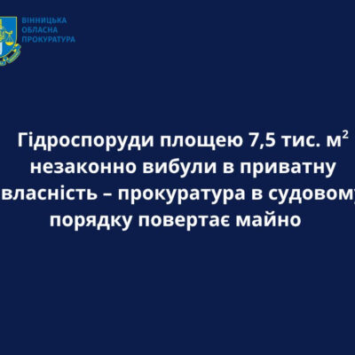 Немирівська окружна прокуратура виявила порушення законодавства під час оформлення права приватної власності на гідротехнічні споруди, розташовані на території Немирівської міської громади. Повідомили Вінницька обласна прокуратура – офіційна сторінка Мова йде про водні об’єкти загальною площею 7,5 тис. м², орієнтовна вартість яких становить понад 184 млн грн. Установлено, що у 2013 році один з громадян незаконно […]