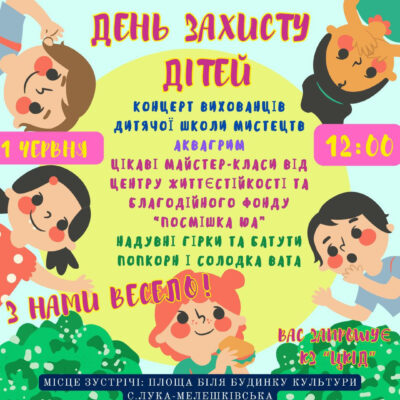 КЗ “Центр культури і дозвілля Лука-Мелешківської сільської ради” організовує захід, присвячений Міжнародному дню захисту дітей, який відбудеться 1 червня. Повідомляє Культура Лука-Мелешківська Початок заходу заплановано о 12:00 на площі біля Будинку культури села Лука-Мелешківська. У програмі передбачено виступи творчих колективів та солістів Дитячої школи мистецтв, що продемонструють різноманітні музичні та художні номери. Також у рамках […]