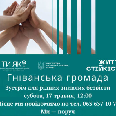 17 травня о 12:00 у Гніванській громаді заплановано проведення зустрічі для родичів осіб, які зникли безвісти. Ініціатива реалізується в межах проєкту «Центр життєстійкості», що є частиною Всеукраїнської програми ментального здоров’я «Ти як?», започаткованої за ініціативи першої леді України. Повідомляє Центр життєстійкості Гніванської громади Захід організовує громадська організація «Центр Промінь надії» за підтримки Міністерства соціальної політики […]