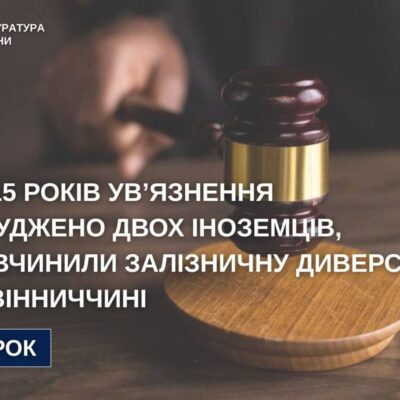 За публічного обвинувачення прокурорів Вінницької обласної прокуратури суд визнав винними двох громадян Республіки Молдова у вчиненні диверсії в умовах воєнного стану за попередньою змовою групою осіб. Про це повідомляє Вінницька обласна прокуратура Вироком Вінницького міського суду кожному з обвинувачених призначено покарання у вигляді 15 років позбавлення волі з конфіскацією майна. Їхні дії кваліфіковано за ч. […]