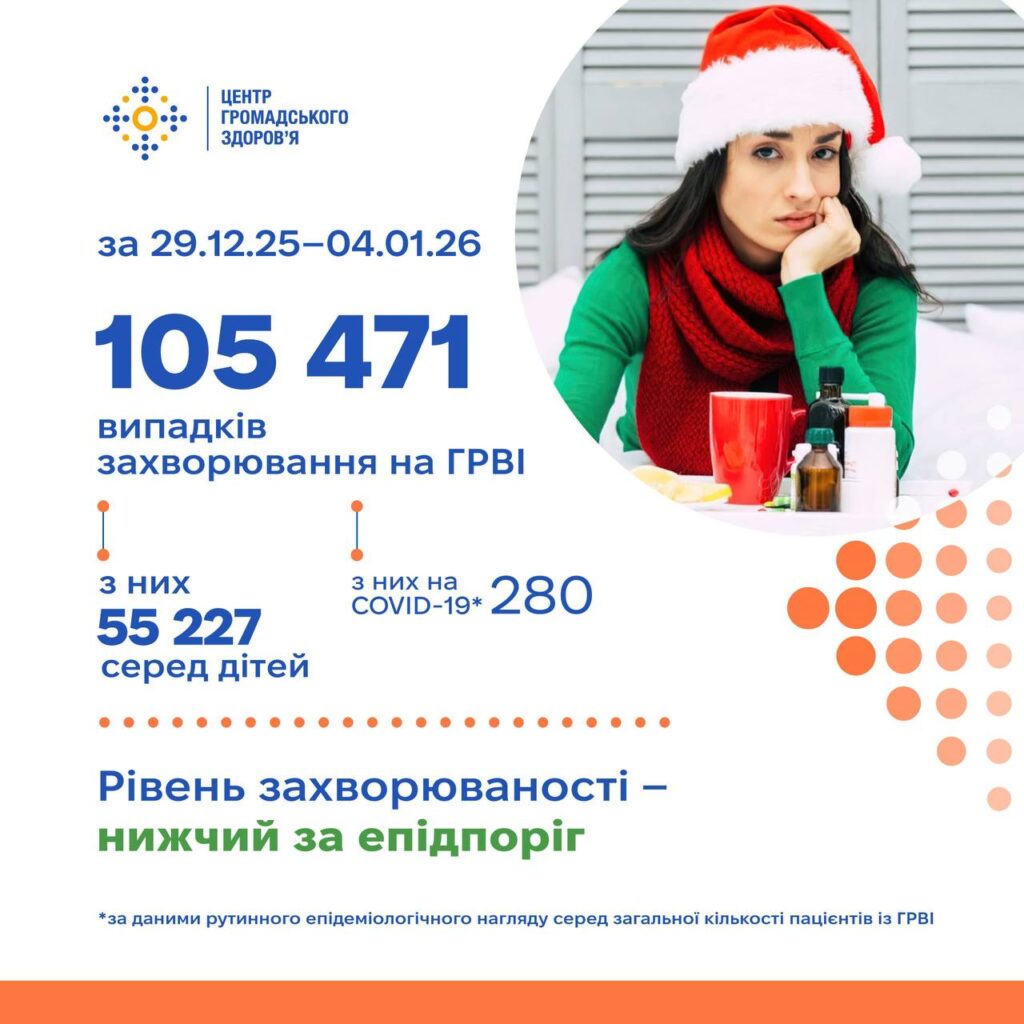 За період з 29 грудня 2025 року до 4 січня 2026 року на ГРВІ захворіли 105 471 людина, серед яких 50 244 дорослих та 55 227 дітей до 17 років. Це на 12,7% менше, ніж тижнем раніше. Госпіталізовано 4068 пацієнтів, серед яких 2341 дитина.