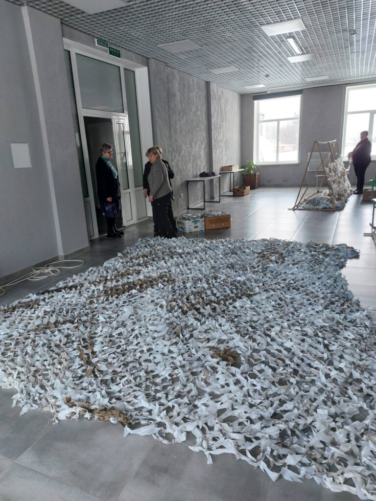 «Плетіння маскувальних сіток — це волонтерська молитва, де кожний вузлик означає захист, а стрічка — побажання нашим захисникам», — розповідають волонтерки.