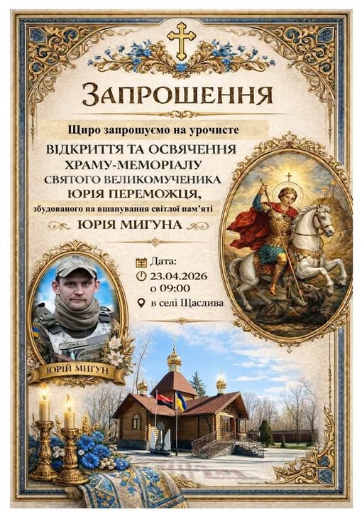 У четвер, 23 квітня, в селі Щаслива відбудеться урочисте відкриття та освячення храму-меморіалу святого великомученика Юрія Переможця. Святиню збудовано на вшанування світлої пам’яті Юрія Мигуна — воїна, який віддав життя за Україну.