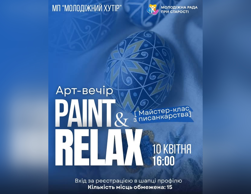 У Вінницько-Хутірському старостинському окрузі 10 квітня відбудеться арт-вечір «PAINT & RELAX», присвячений великоднім традиціям. Захід організовують для жителів громади, аби популяризувати писанкарство та створити простір для відпочинку й емоційного відновлення через творчість.