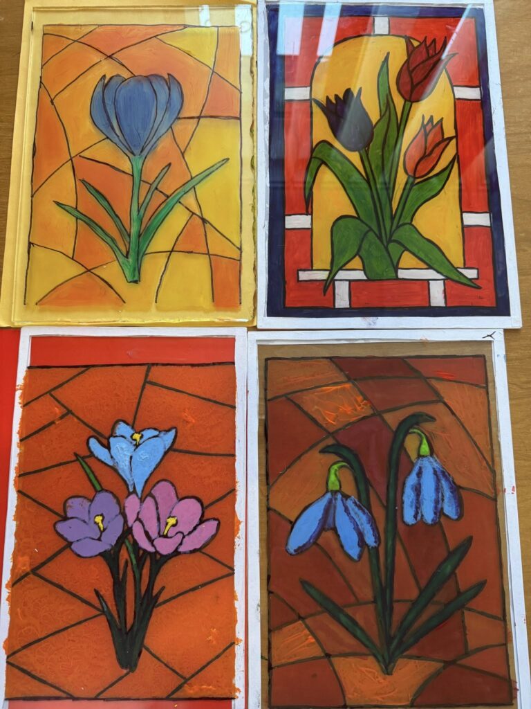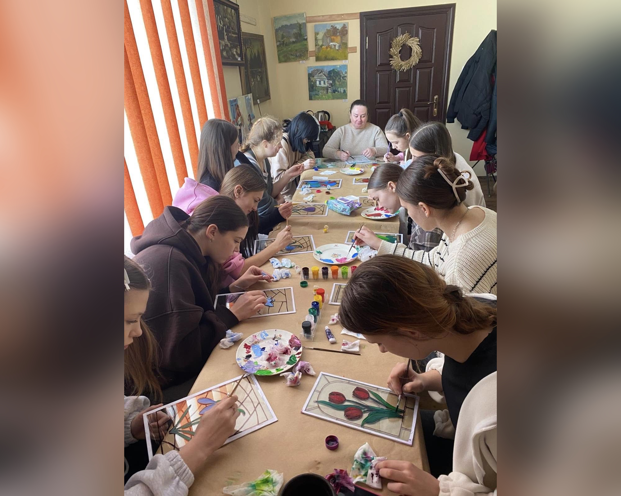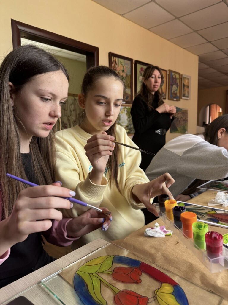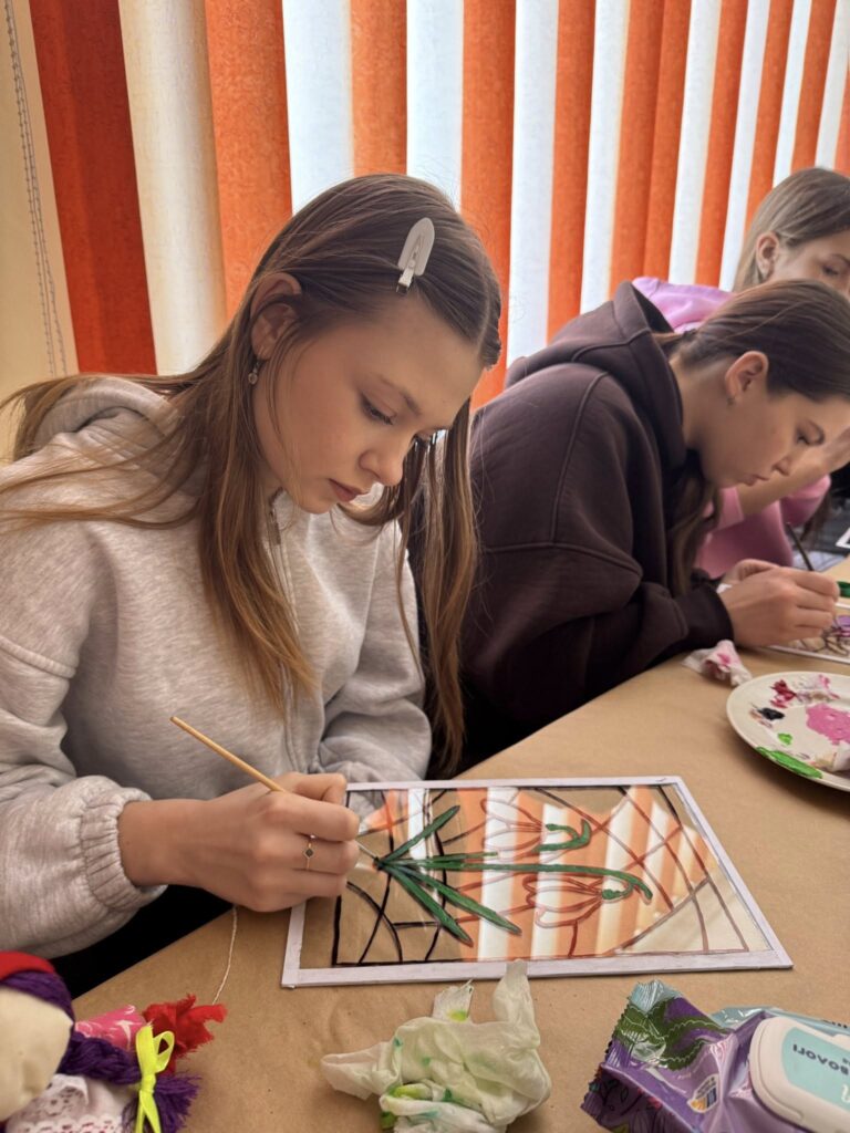 Під час заходу дівчата ознайомилися з особливостями старовинної техніки розпису, де зображення створюється на зворотному боці прозорої основи. Саме така методика надає вітражам особливого блиску, глибини та виразності.