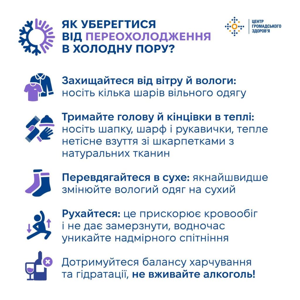 Центр громадського здоров’я України наголошує: не поливайте переохолоджені ділянки шкіри гарячою водою.