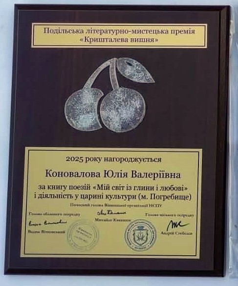 Українську письменницю Юлію Коновалову відзначили Подільською літературно-мистецькою премією «Кришталева вишня». Високу нагороду присудили за її поетичну творчість, зокрема за збірку «Мій світ із глини і любові», а також за вагомий внесок у розвиток культури рідного краю.